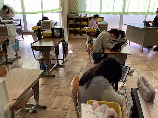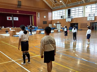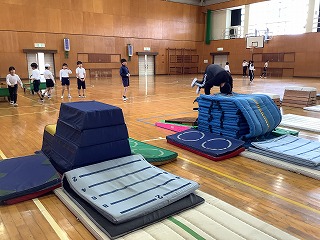 4年生体育 台上前転の練習です。いくつか用意された練習場所から、自分に合った場所を選んで練習しました。