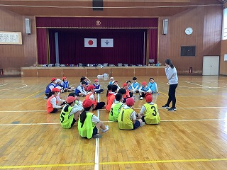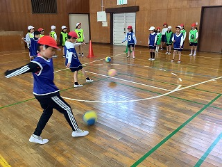 2年生体育 ボール蹴りゲームをやりました。パスされたボールを足でトラップできたら得点です。ゲームをするチーム、ボール拾いチーム、得点を数えるチーム、それぞれ自分たちの役割を果たしていました。