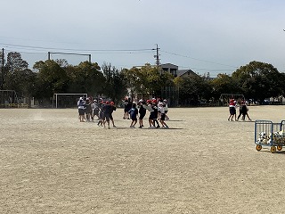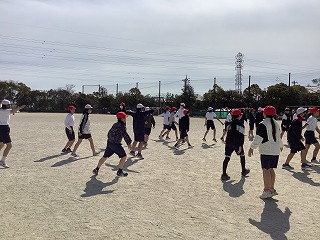 6年生体育 2クラス合同で活動しました。まずは、体つくりの運動です。いろいろな鬼ごっこで体を動かしました。