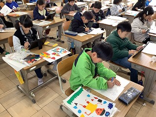2年生図工 色タックを貼って紙版画を作っています。完成したら版に水をつけて刷ります。