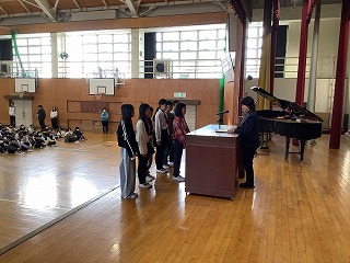 5年生が半田市小学校音楽会で歌った合唱を全校児童の前で披露しました。