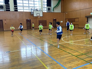 5年生体育 バスケットボールに取り組んでいます。パス&ラン、フリースペースに素早く動いてパスをつないでシュート!!